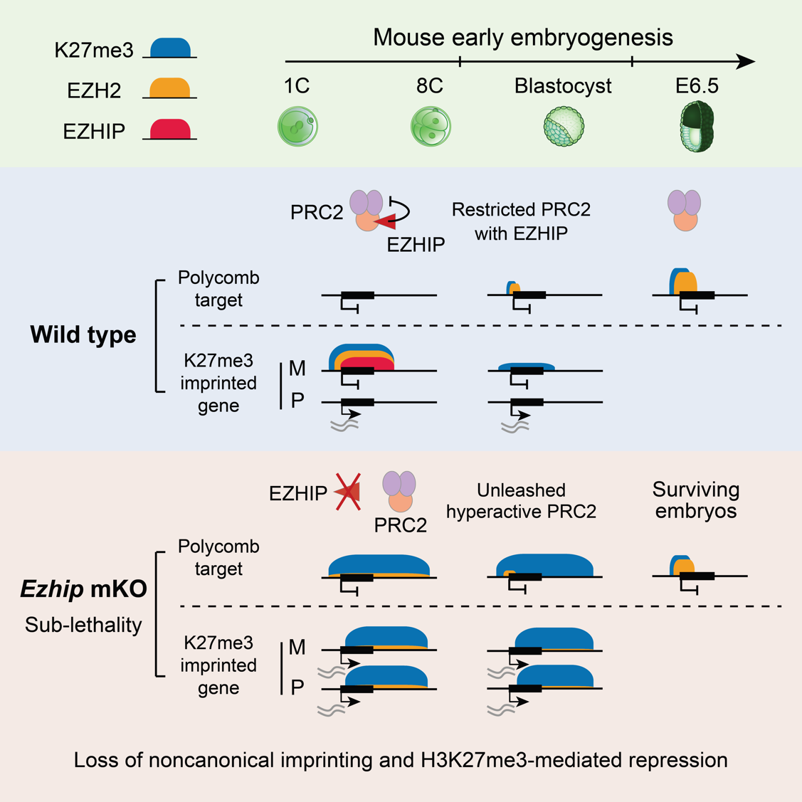 研究团队进一步证明,EZHIP在早期胚胎中调控PRC2非经典染色质结合与H3K27me3代间重编程。EZHIP是一种内源性PRC2抑制因子,仅在生殖细胞中特异性表达,而在其他细胞类型中被DNA甲基化沉默3。有趣的是,作者发现Ezhip mRNA在卵母细胞中大量积累,但处于翻译抑制状态。Ezhip仅在受精前后两天被活跃翻译,从而在着床前胚胎中表达丰度极高的蛋白。在野生型小鼠胚胎中,H3K27me3在着床前发生了全局性的去甲基化,而EZHIP缺失的小鼠胚胎中,去甲基化过程受阻,H3K27me3水平快速升高。更有趣的是,野生型胚胎中亲本来源的H3K27me3不对称性能维持到囊胚阶段,并介导非经典基因印记记忆;而EZHIP缺失后,H3K27me3不对称性在二细胞阶段已经完全丧失,导致非经典基因印记随之丢失。进一步的机制研究表明,着床前胚胎中EZHIP与PRC2能够共同结合在非经典H3K27me3结构域,在染色质上形成H3K27me3-PRC2-EZHIP复合体,以此限制PRC2的酶活和扩散4。EZHIP缺失后,PRC2不再被限制,继而在全基因组大部分区域催化了H3K27me3修饰,掩盖了几乎所有亲本来源的H3K27me3记忆。与常规认知相悖的是,这种广泛分布的H3K27me3修饰并未引起全局性基因沉默,反而让H3K27me3丧失了原本的抑制功能,导致非经典印记基因的异常激活和印记X染色体失活的失调。这可能是因为H3K27me3的效应因子(例如PRC1和PRC2)被大量出现的H3K27me3稀释,无法有效富集在正确的靶基因区域,从而导致基因抑制功能失效。另外,EZHIP缺失所造成的H3K27me3在全基因组范围内的过度积累还阻碍了后续多梳靶基因区域H3K27me3的重建,并伴随着胚胎植入后部分致死现象。