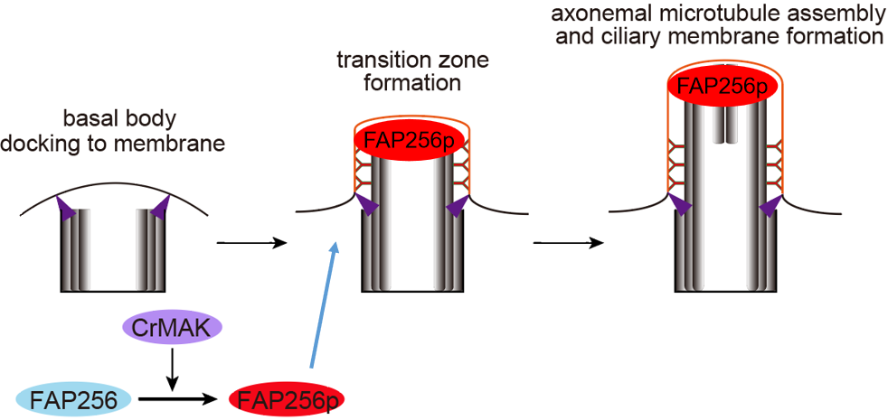 MAK属于RCK蛋白激酶家族,在哺乳动物中存在3个成员: ICK, MAK 和MOK;在斑马鱼中仅有一个成员MAK。有趣的是,小鼠中敲除MAK导致视觉纤毛过度延长,而双敲除MAK和ICK,视觉纤毛无法形成;相比之下,在斑马鱼中敲除MAK则导致视觉纤毛不能组装。因此,MAK和ICK如何调控纤毛的机制不详。RCK家族在衣藻中具有MAK和MOK两个成员。研究团队发现,敲除MAK,衣藻纤毛不能发生。利用微管稳定的药物紫杉醇处理mak突变体细胞,纤毛组装得到部分恢复,说明MAK调控微管的组装和稳定性。通过邻位标记,团队发现CEP104/FAP256是MAK的潜在底物。体内和体外实验证明MAK直接磷酸化CEP104/FAP256。CEP104/FAP256在纤毛顶端富集,未被磷酸化的CEP104/FAP256不能在纤毛顶端富集,纤毛再生具有缺陷。但是CEP104/FAP256的突变体在稳态时仍然具有正常的纤毛,说明MAK还有其它未知的底物。总之,该研究首次阐明了轴丝微管的组装调控机制。