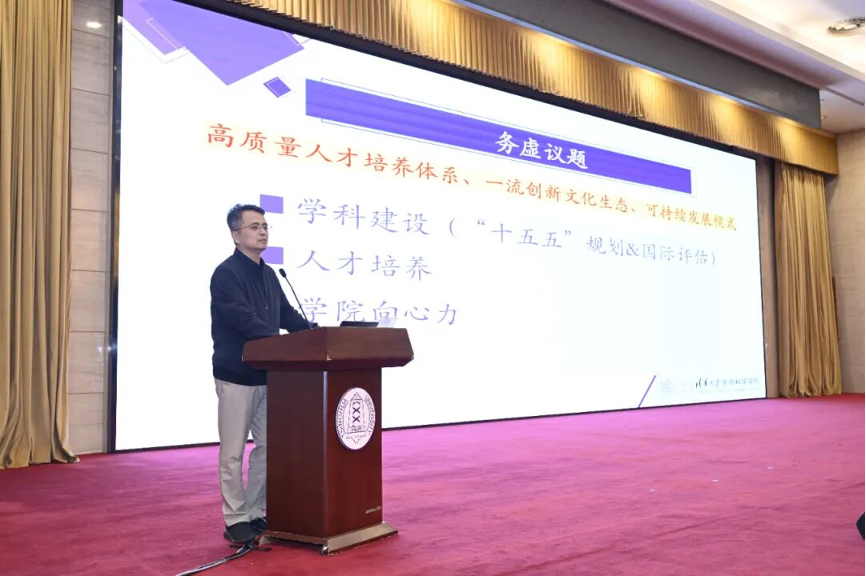 张伟就“提升学院向心力”议题进行了汇报。他总结,“提升学院向心力”应从制度、文化、生态三个层面协同发力。在制度层面,创新性地提议设立“科学经理人”岗位,专职对接外部资源;在文化层面,建议通过教学科普与校友会拓展宣传,延续生命中心“HAPPY HOUR”活动,增加教师非正式聚会,营造活跃氛围;在生态层面,则聚焦于加强基础学科课程建设,平衡微观与宏观,开发精品通识课,为学院发展夯实育人根基。通过多维举措并举,方能全面增强学院的凝聚力与向心力。