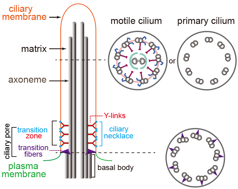 纤毛是突出于细胞表面的细胞器,主要由纤毛膜及其包裹的9+2或9+0 细胞微管所构成 (图1)。纤毛不仅具有运动功能,而且作为 “细胞天线”感知外界信号,进而调控个体发育和生理稳态。纤毛的缺陷可导致多种疾病,如男性不育,内脏翻转,肾囊肿,多指症等。纤毛中的细胞微管又称轴丝微管(axonemal microtubules),是纤毛的主要结构。在纤毛发生过程中,中心粒转化为纤毛基体并锚定在细胞膜,随后组装纤毛过渡区,轴丝微管延伸并被纤毛膜包裹,最终形成纤毛。轴丝微管组装所需要的微管蛋白来自于“鞭毛内运输”介导的运输和微管蛋白扩散,但是,轴丝微管的组装是否需要调控以及如何调控扔是未解之谜。