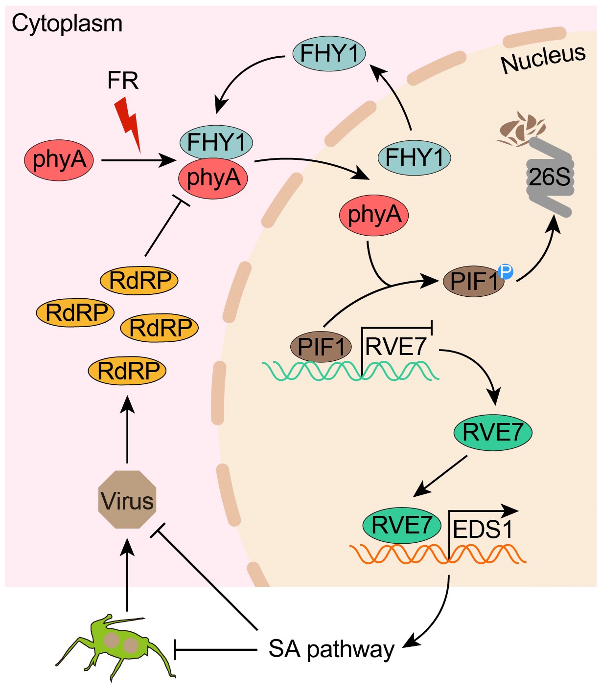研究发现,在远红光照射下,phyA被激活并转入细胞核,促使转录因子PIF1发生泛素/26S蛋白酶体依赖的降解,解除其对转录因子RVE7(REVEILLE7)的抑制。随后,RVE7直接结合免疫核心调控因子EDS1(Enhanced Disease Susceptibility 1)的启动子,增强水杨酸(SA)信号通路,从而显著增强植物对多种病毒的抗性(图1)。值得注意的是,该远红光诱导的phyA–RVE7–EDS1信号模块不仅抵御病毒感染,还同时提高了植物对蚜虫的抗性,实现了对病毒病害的“双重阻断”。