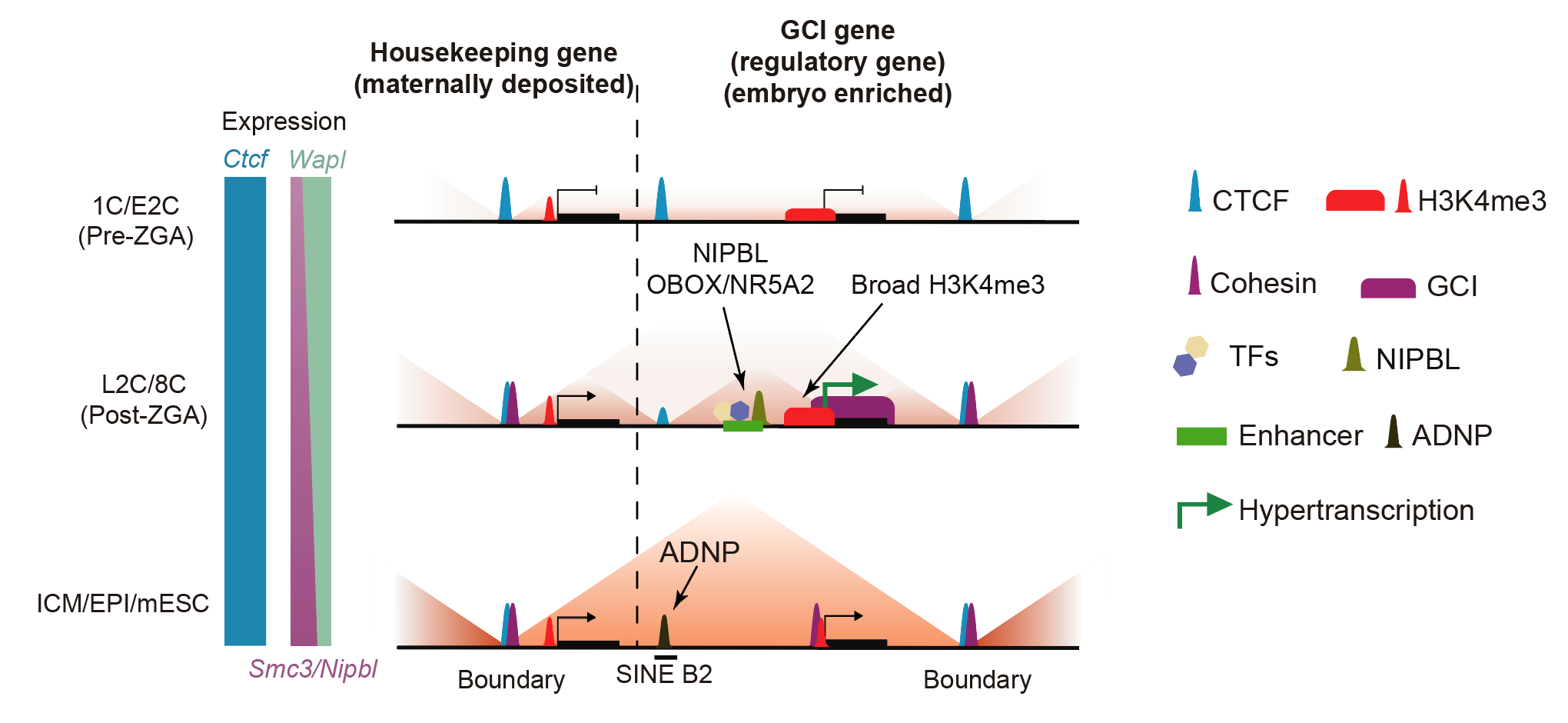 GCI genes are enriched for key regulatory genes involved in chromatin organization, developmental regulation, and cell fate determination. These genes exhibit broad promoters of H3K4me3, and are enriched for active enhancers and binding of key TFs and NIPBL in their neighbor regions, providing abundant cohesin loading sites for GCI formation. Previous studies suggest that RNA polymerase can act as a barrier by pushing or hindering it from sliding on chromatin. Consistently, GCIs function as transcription-dependent insulators, cooperating with adjacent CTCF sites to form TAD-like interaction domains, without obvious directional preference. Partial cohesin knockdown weakened GCI boundaries and downregulated GCI gene expression, ultimately causing embryonic arrest at the morula stage. Further analyses showed that GCI genes, as key regulators, exhibit low cell-to-cell transcription variability, whereas cohesin KD increases transcriptional heterogeneity among blastomeres of 8C embryos, suggesting that GCIs may help maintain stable expression of critical regulatory genes during embryonic development.